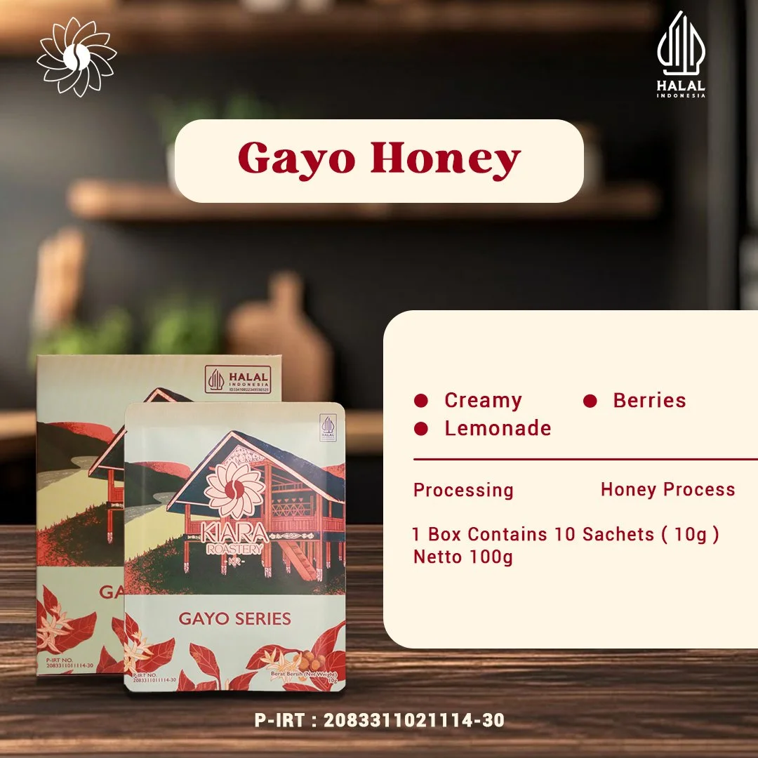 Gayo Honey Processing Method: HoneyOrigin: Bener MeriahNotes: Creamy, Lemonade, Berries 1 Box Isi 10 pcs 10 Sachets Rp125.000,- No. P-IRT: 2083311011114-30ID Halal: ID33410022349550525 Tokopedia Shopee